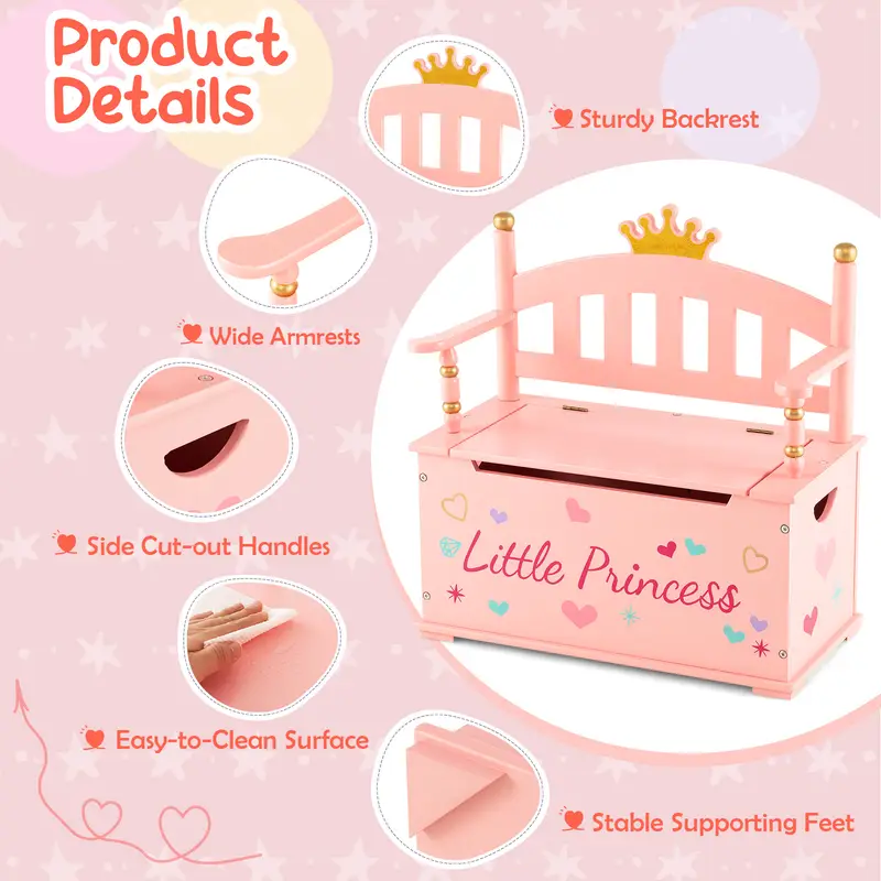 The GIANTEX Kids Toy Storage Organizer is a delightful and practical addition to any child’s space. Designed for girls aged 3 to 6, this pink 2-in-1 toy chest and bench brings both style and function to kids’ rooms, playrooms, or nurseries. Featuring a charming crown pattern, it sparks the imagination while helping to keep toys and essentials neatly organized. Constructed from durable artificial board and high-density MDF cork fiberboard, it’s built to withstand regular use, while the safety hinge and high backrest add extra security for young users.