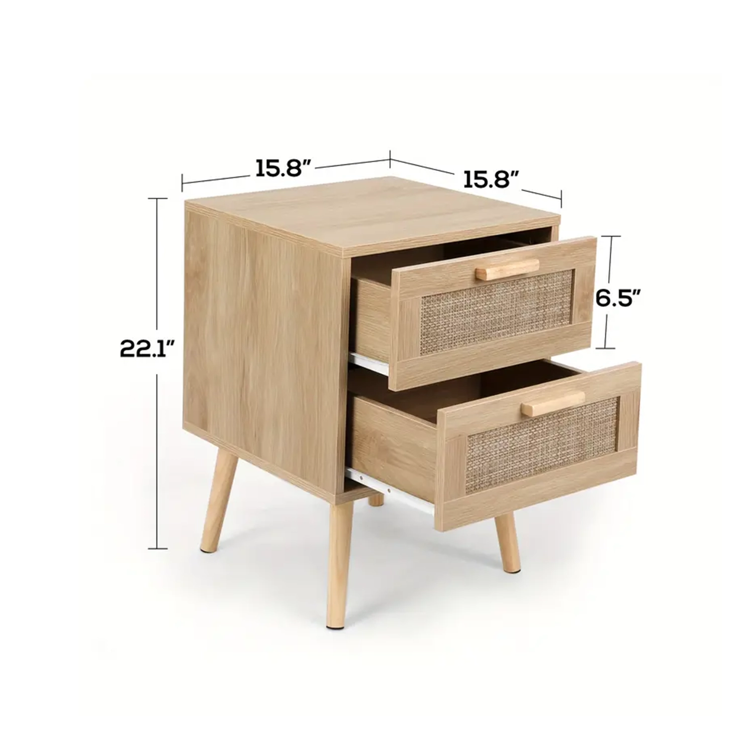 Rattan Nightstand Set, Wooden End Table With 2 Drawers, Solid Wood Legs